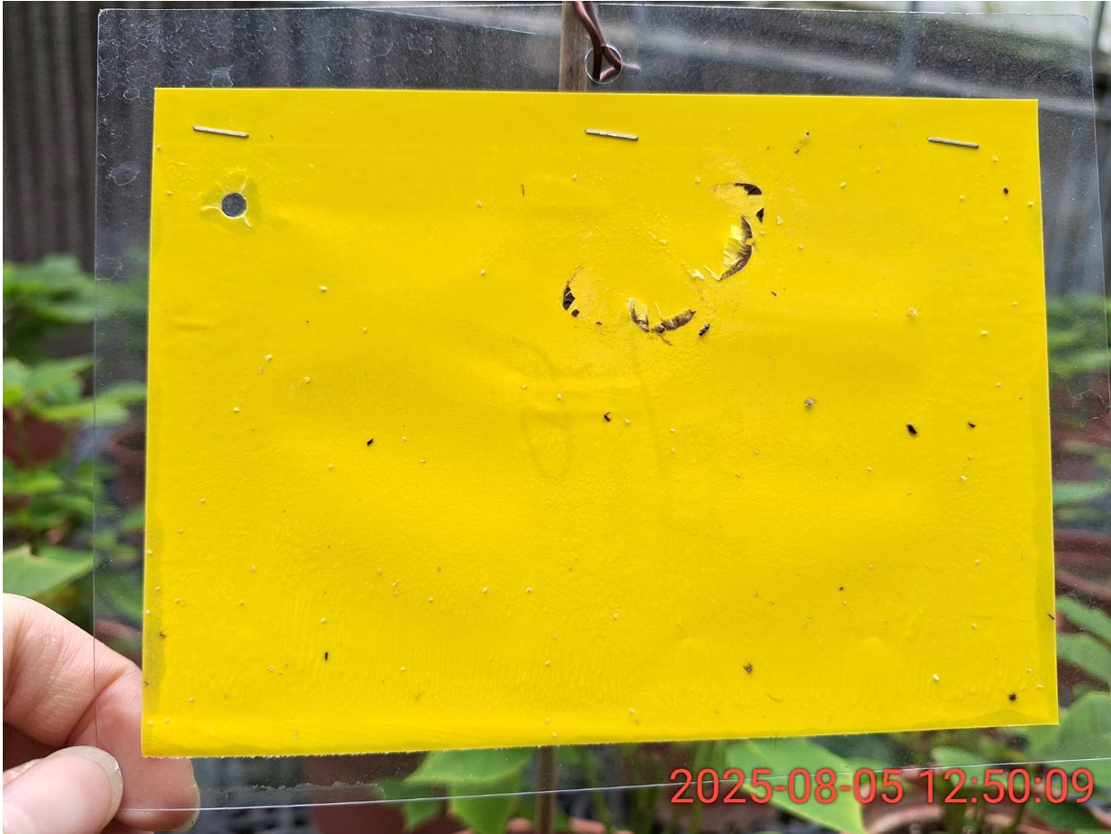 四、黃色黏紙誘殺成蟲及監測密度,懸掛高度以貼近作物上方為宜。單週之粉蝨平均數量達50隻/張時,進行藥劑防治。