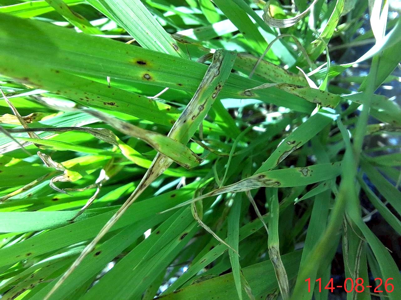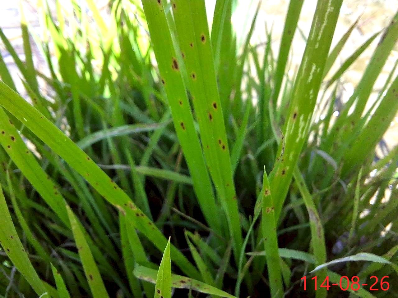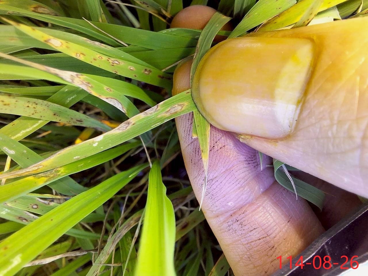 一、桃園市稻熱病於龜山區部分已插秧稻田之秧砧上現蹤。近日氣候日夜溫差大、濕度高,有利病害發生。籲請農民加強防範工作。桃園市政府、防檢署及田邊好幫手關心您。 二、葉稻熱病在葉片上初呈暗綠色小斑點,後轉為紅褐色,斑點擴大後成圓形至紡錘形,成熟病斑中間轉灰白色。多個病斑能融合成不規則形之大斑。嚴重時造成葉片枯死;胡麻葉枯病大型病斑沿葉脈呈長橢圓形,兩端較圓寬,黃暈明顯但較窄,常易被誤認為稻熱病斑,但稻熱病之病斑兩端較尖黃暈不明顯,兩者間有頗大差異。防治建議