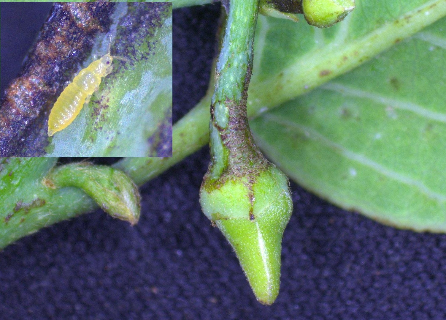 二、小黃薊馬常聚集於嫩梢、花朵及幼果,受害組織會出現褐色斑塊甚至捲曲變形,幼果也可能留下不規則的挫傷斑塊,影響果實品質。