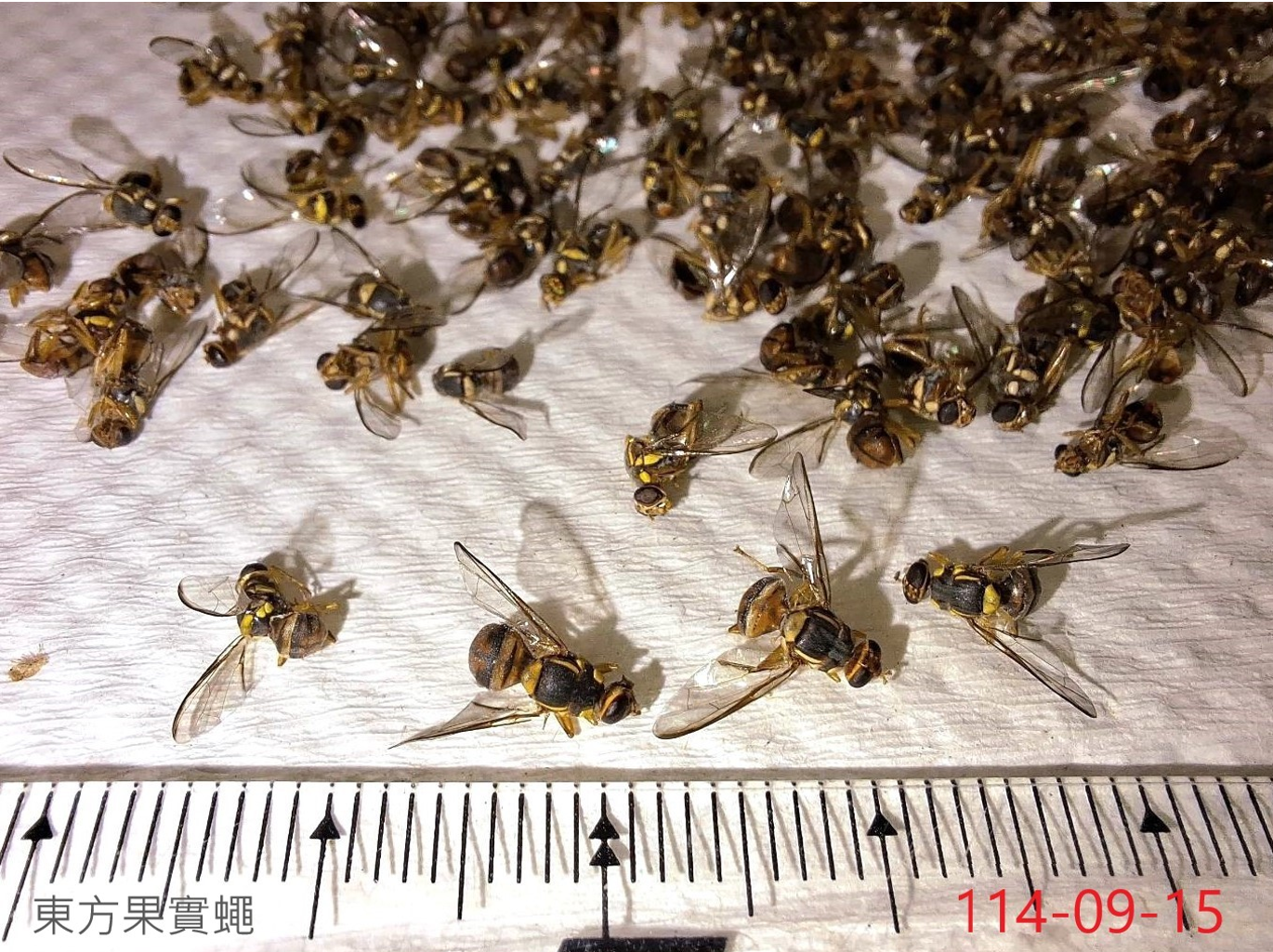 二、東方果實蠅俗稱「蜂仔」,其生活週期短、產卵能力強,且成蟲移動性高,容易大量繁殖孳生。雌蟲產卵於果中,幼蟲蛀食果肉引起果實流膠、腐爛及落果。