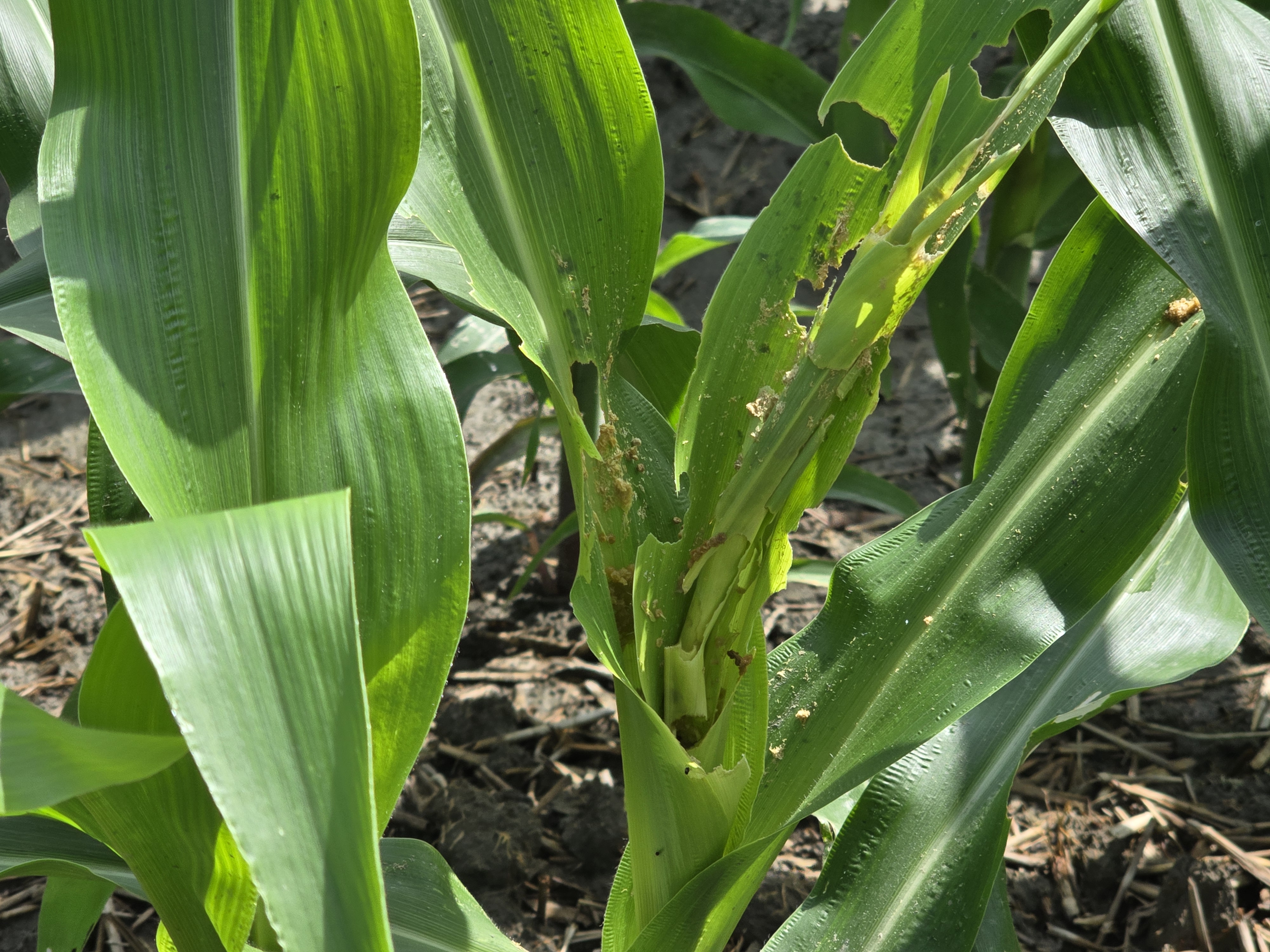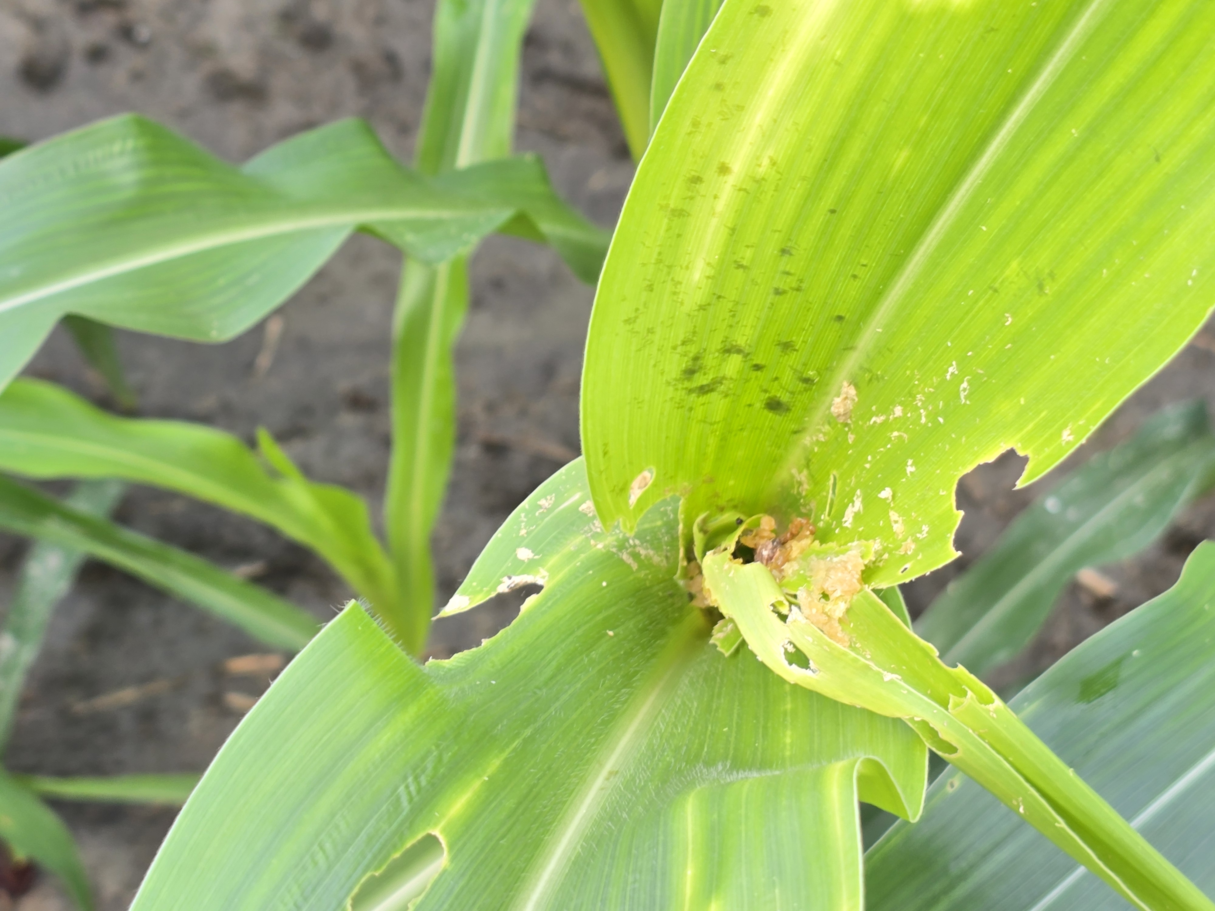 一期稻作採收後,本縣已有農民開始栽種硬質玉米,目前監測的鄉鎮陸續有秋行軍蟲零星危害,目前玉米為幼苗期,籲請農民加強防範工作,以降低損失。 常見危害狀: 1.初齡幼蟲造成窗格紋食痕、3齡以上幼蟲取食生長點取食處具大量蟲糞與較大蛀孔、破損葉片。 2.花穗、玉米鬚及果粒亦會被啃食。 秋行軍蟲食量大易造成嚴重災情,籲請農民注意,並加強防治工作,避免蟲害蔓延擴散。防治建議