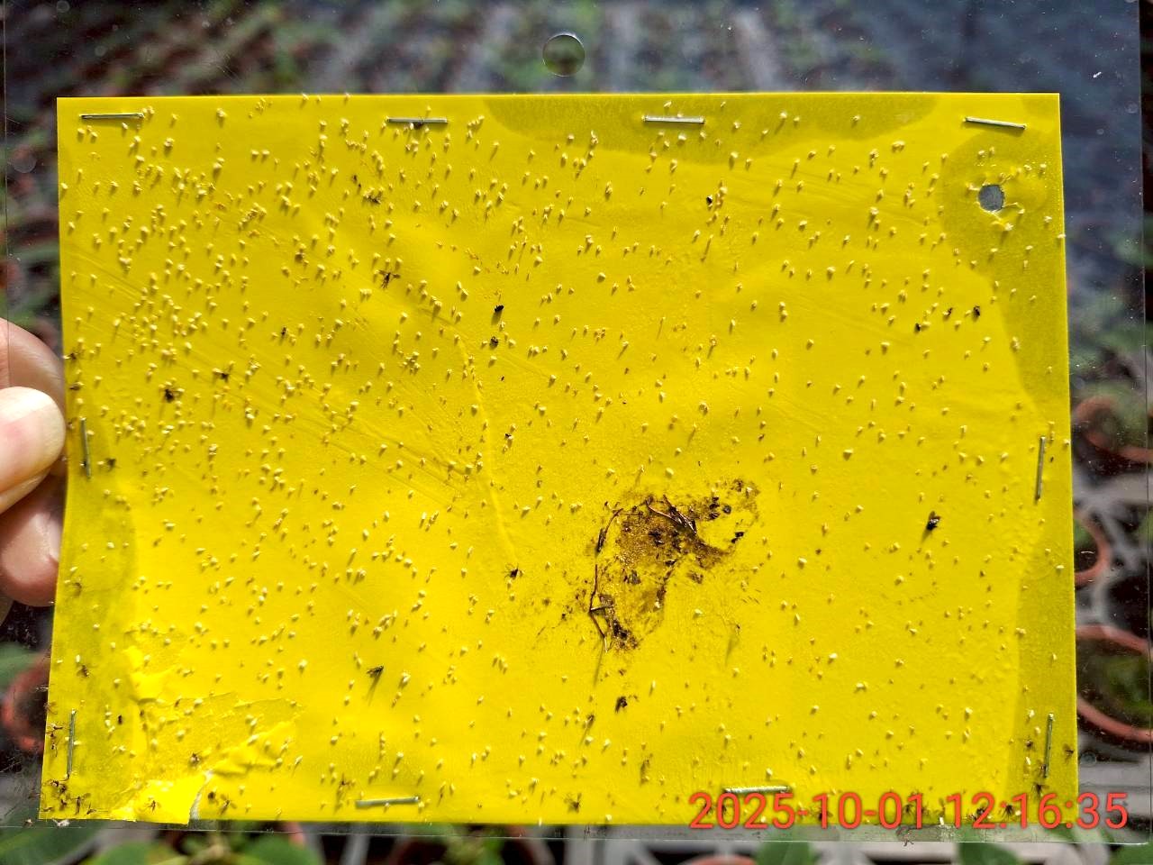 四、黃色黏紙誘殺成蟲及監測密度,懸掛高度以貼近作物上方為宜。單週之粉蝨平均數量達50隻/張時,進行藥劑防治。
