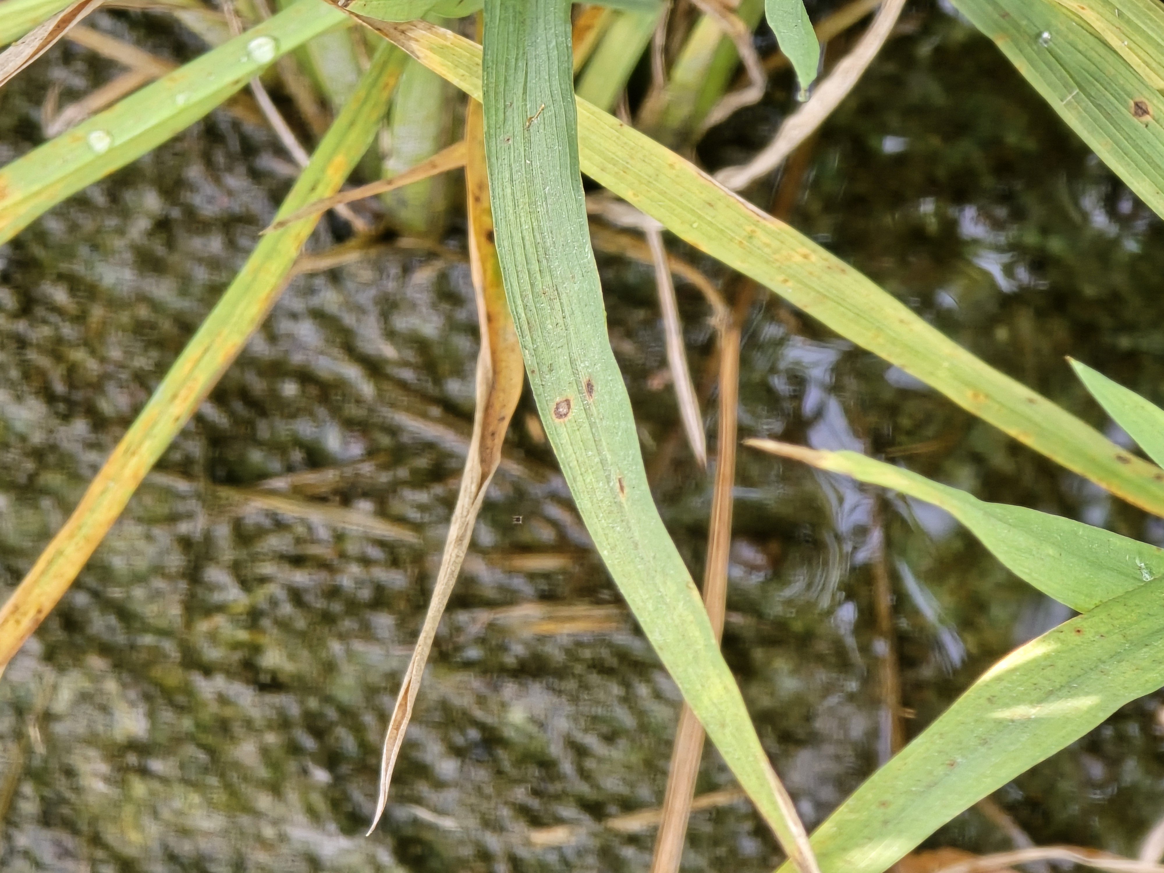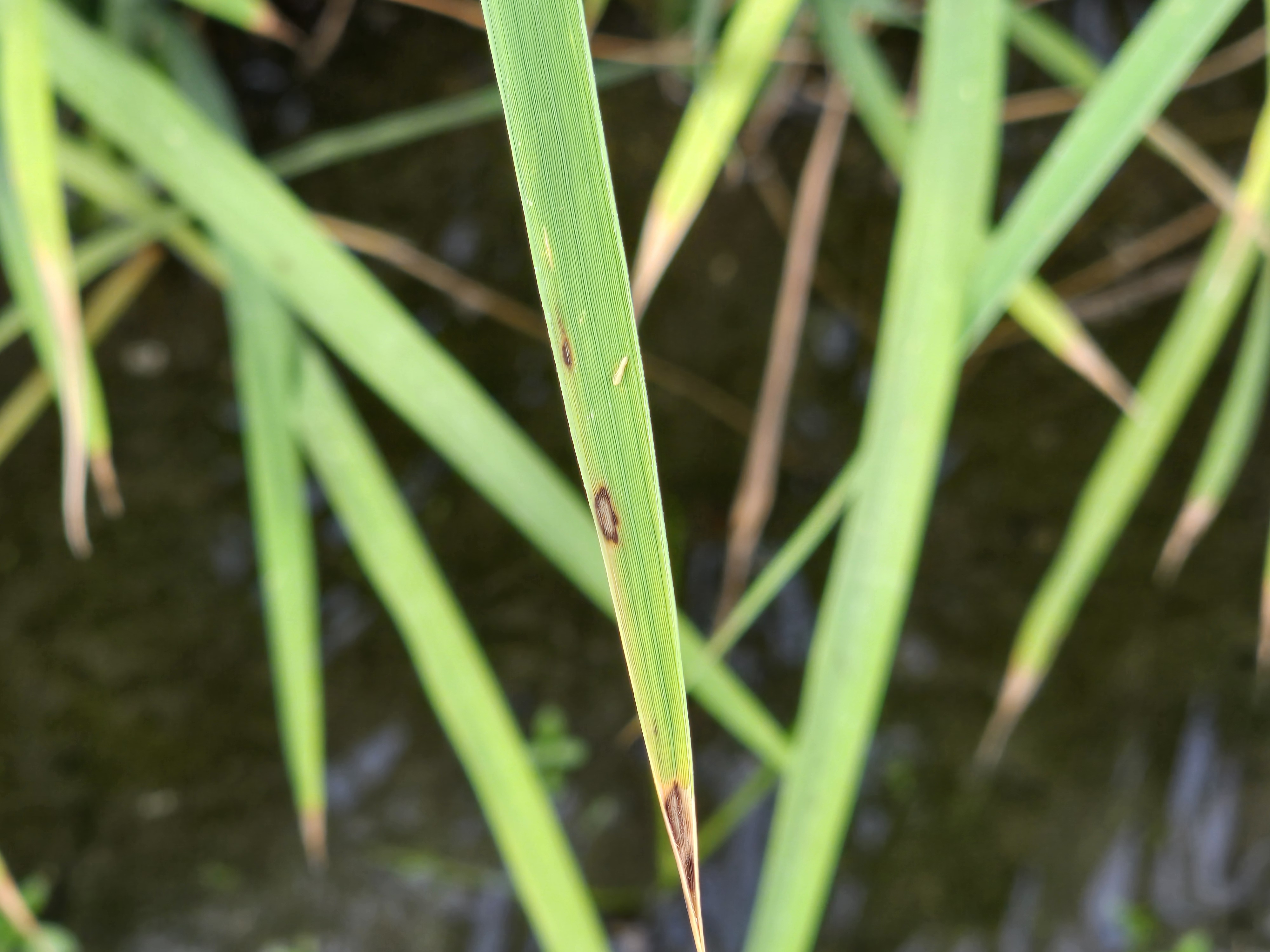 葉稻熱病:在葉片上初呈暗綠色小斑點,後轉為紅褐色。斑點擴大後成圓形或紡錘形,顏色先為褐色,後中間呈現灰白色。多個病斑能互相融合形成不規則形之大病斑。最終造成葉片枯死狀。