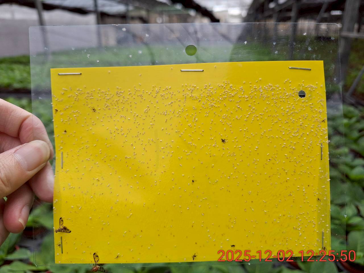 四、黃色黏紙誘殺成蟲及監測密度,懸掛高度以貼近作物上方為宜。單週之粉蝨平均數量達50隻/張時,進行藥劑防治。